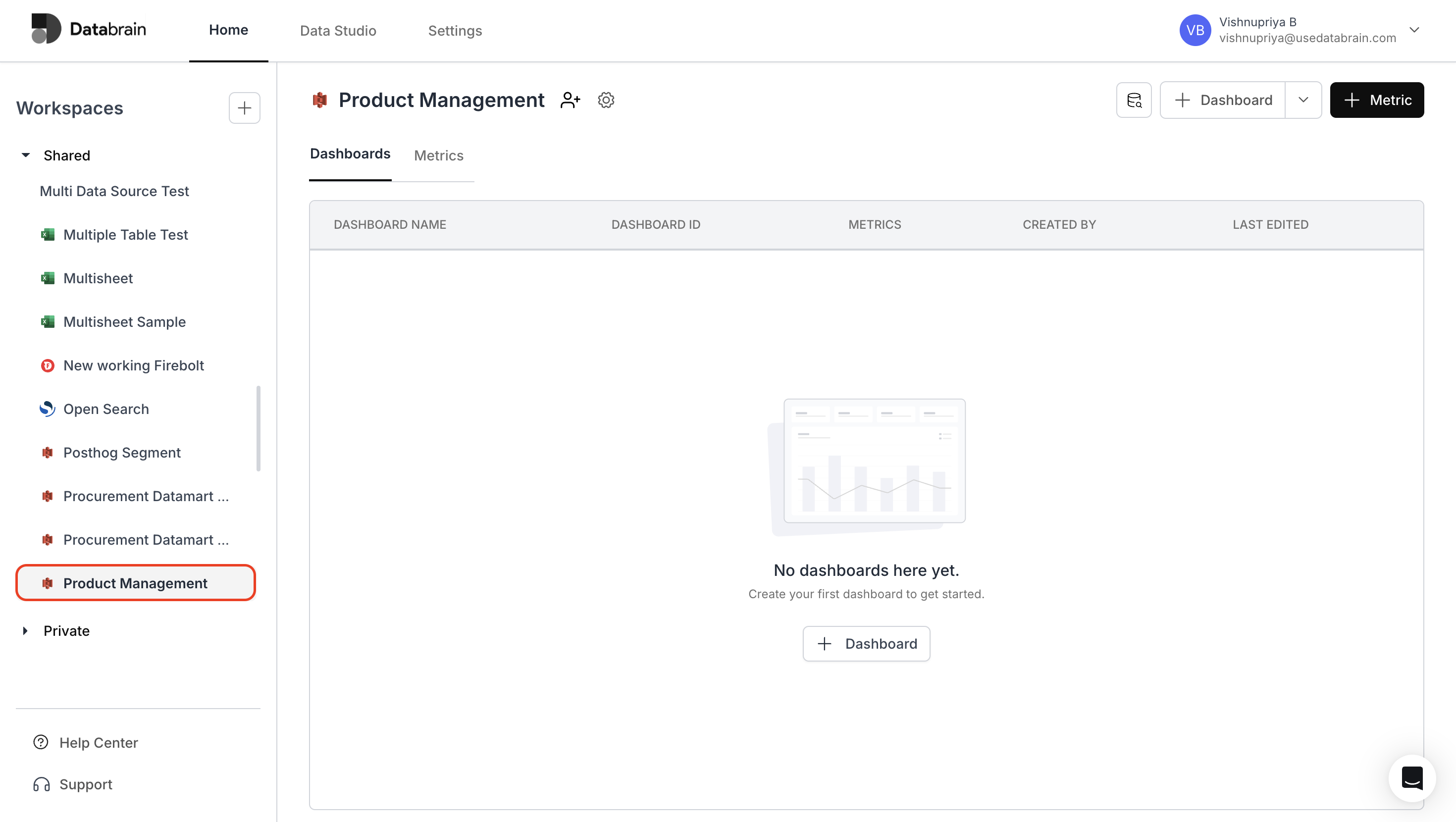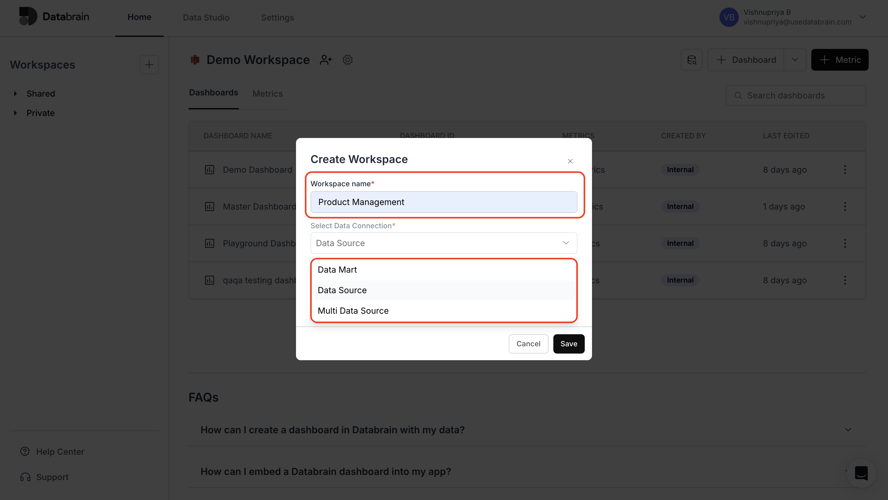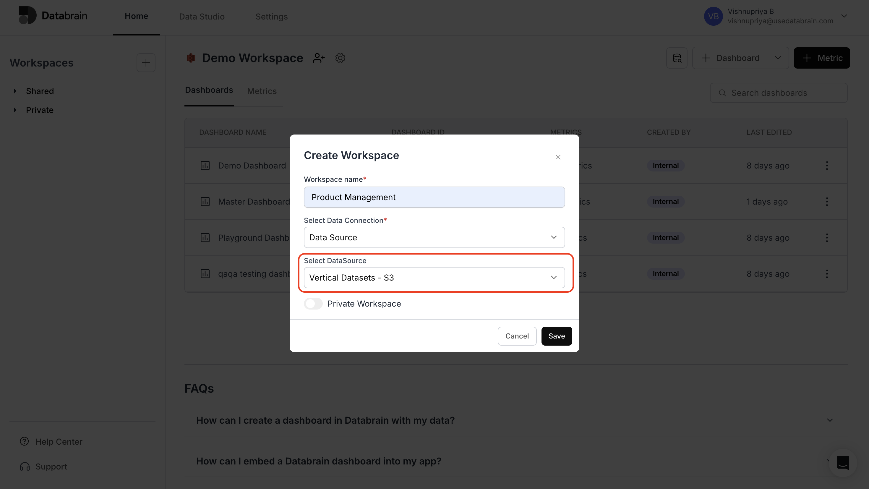 A workspace in Databrain is a dedicated environment where teams can organize and manage their data analytics projects. It serves as a collaborative space where team members can create, share, and analyze metrics specific to their department or project needs.