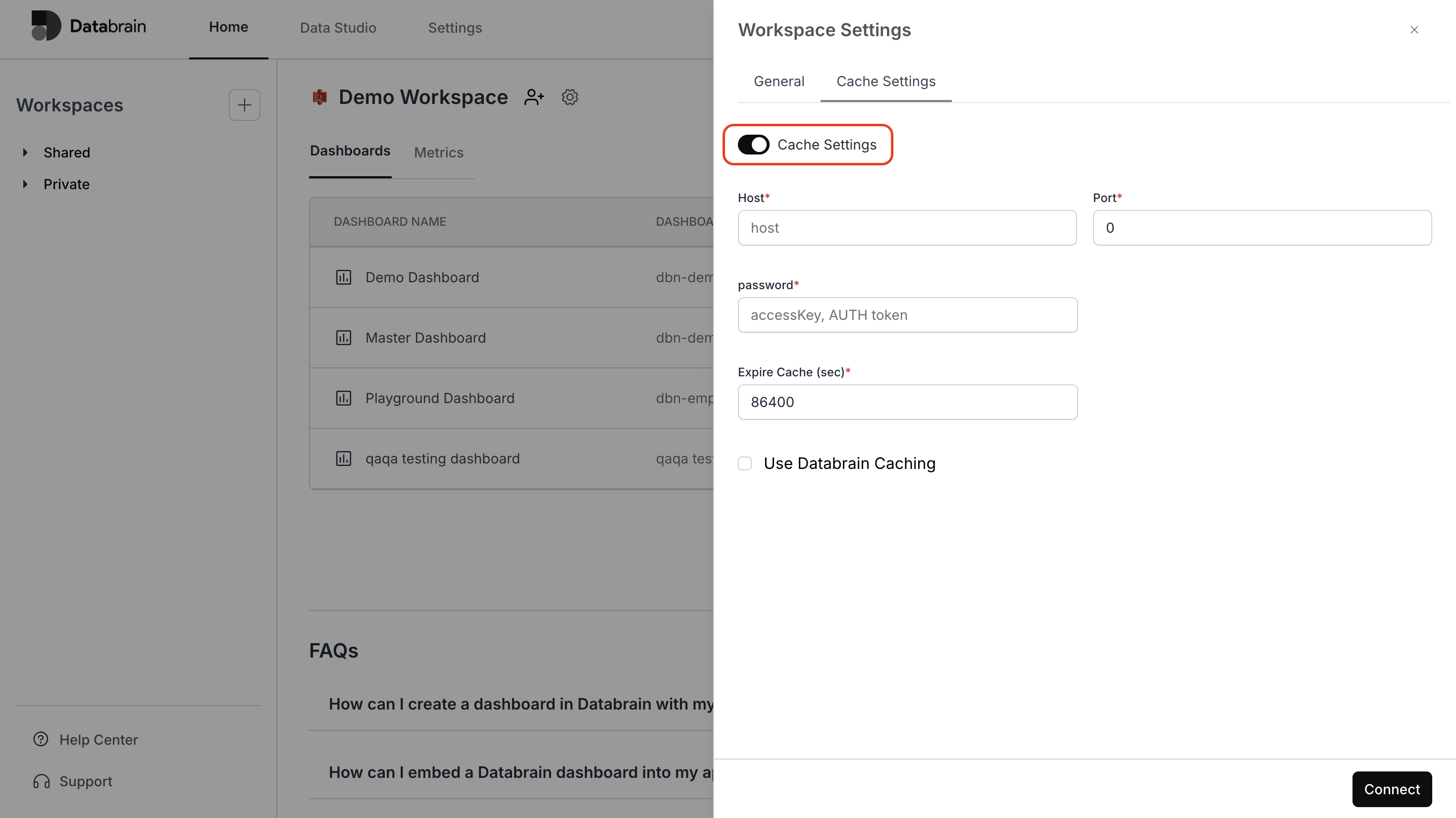 Configure Cache Settings: Under “Cache Settings”, toggle “Cache Settings” to enable or disable data caching.- Set your Host and Port